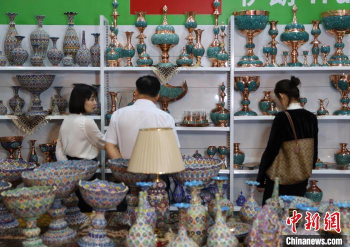 民众在宁夏国际会展中心国际展区内的伊朗展位内选购当地的特色商品。(图片来源:中新网)
