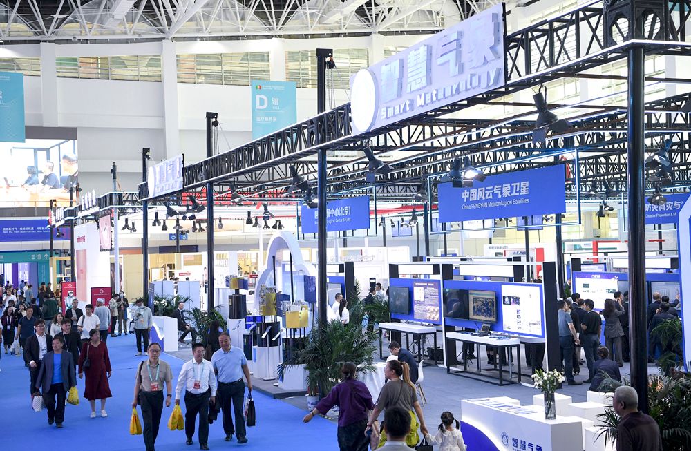 第六届中国—阿拉伯国家博览会首次设置的智慧气象展区。本届博览会重点围绕数字经济、清洁能源、新型材料、跨境电商、现代农业、智慧气象等领域,举办会议论坛、展览展示等活动。(图片来源:新华社)