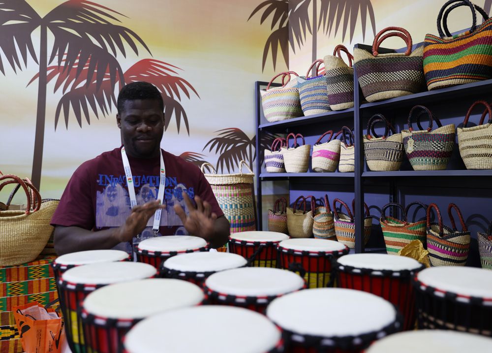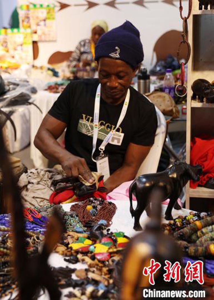 来自马里共和国的参展商正在打磨当地的文创产品。(图片来源:中新网)