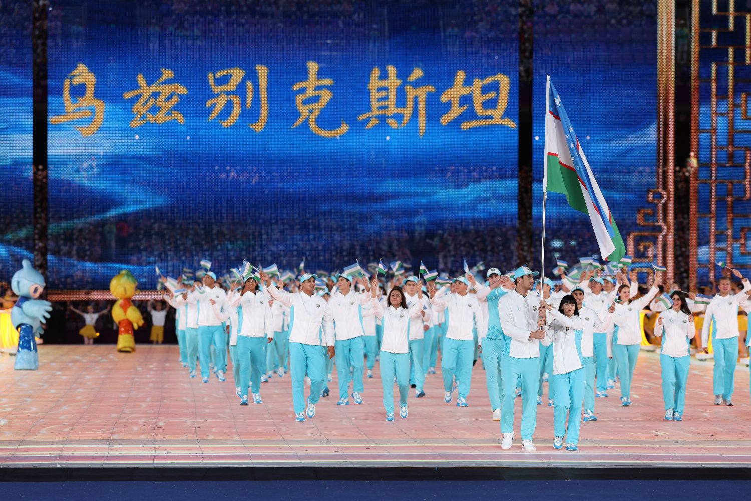 图为乌兹别克斯坦代表团入场。(图片来源:中新社)
