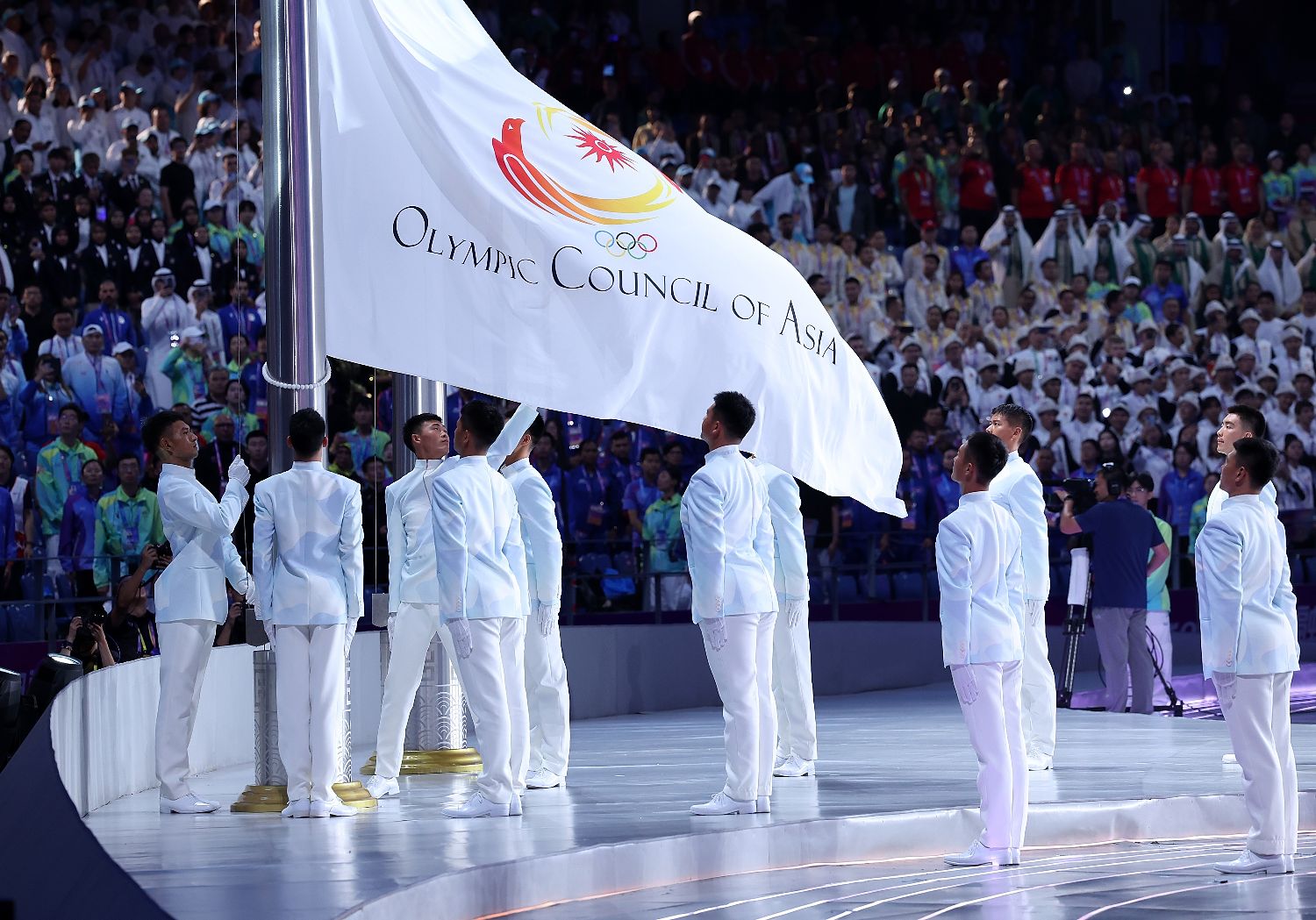 图为亚奥理事会会旗在开幕式上升起。(图片来源:新华社)