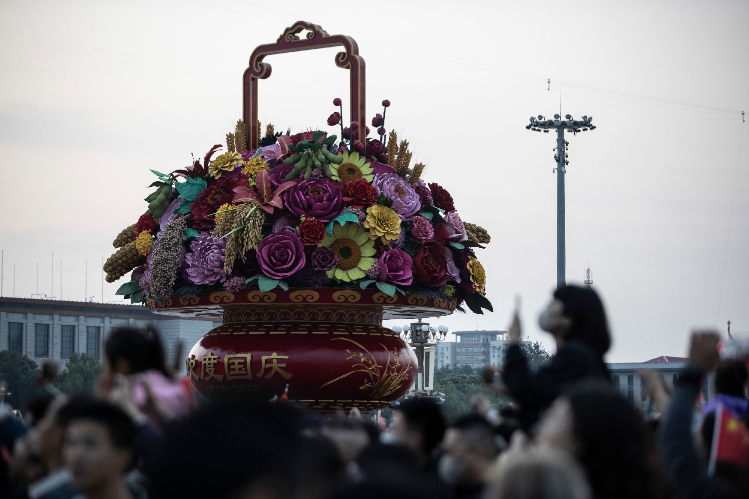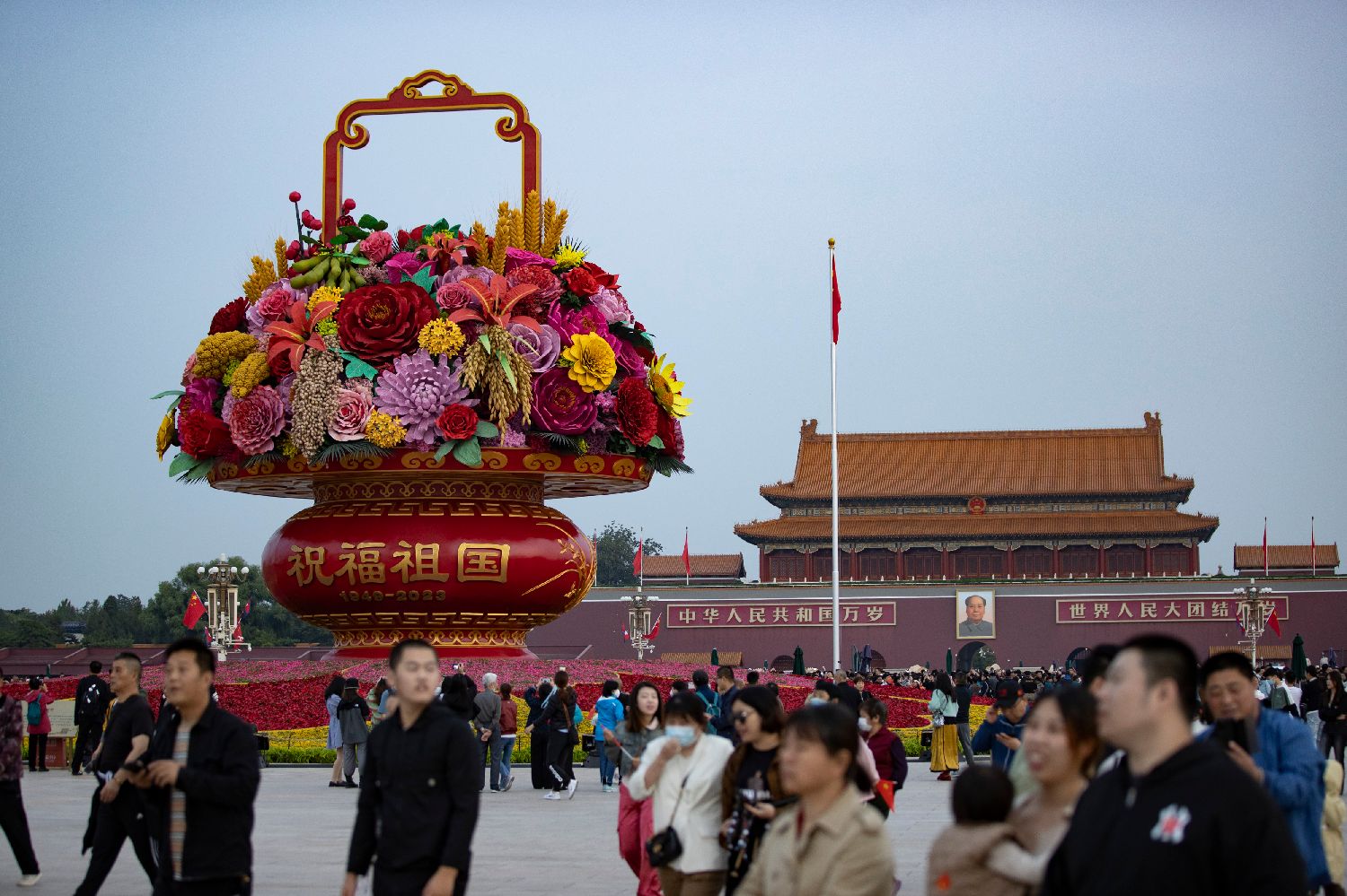 2023年9月25日,民众在中国国庆节主题花坛前观看升旗仪式。