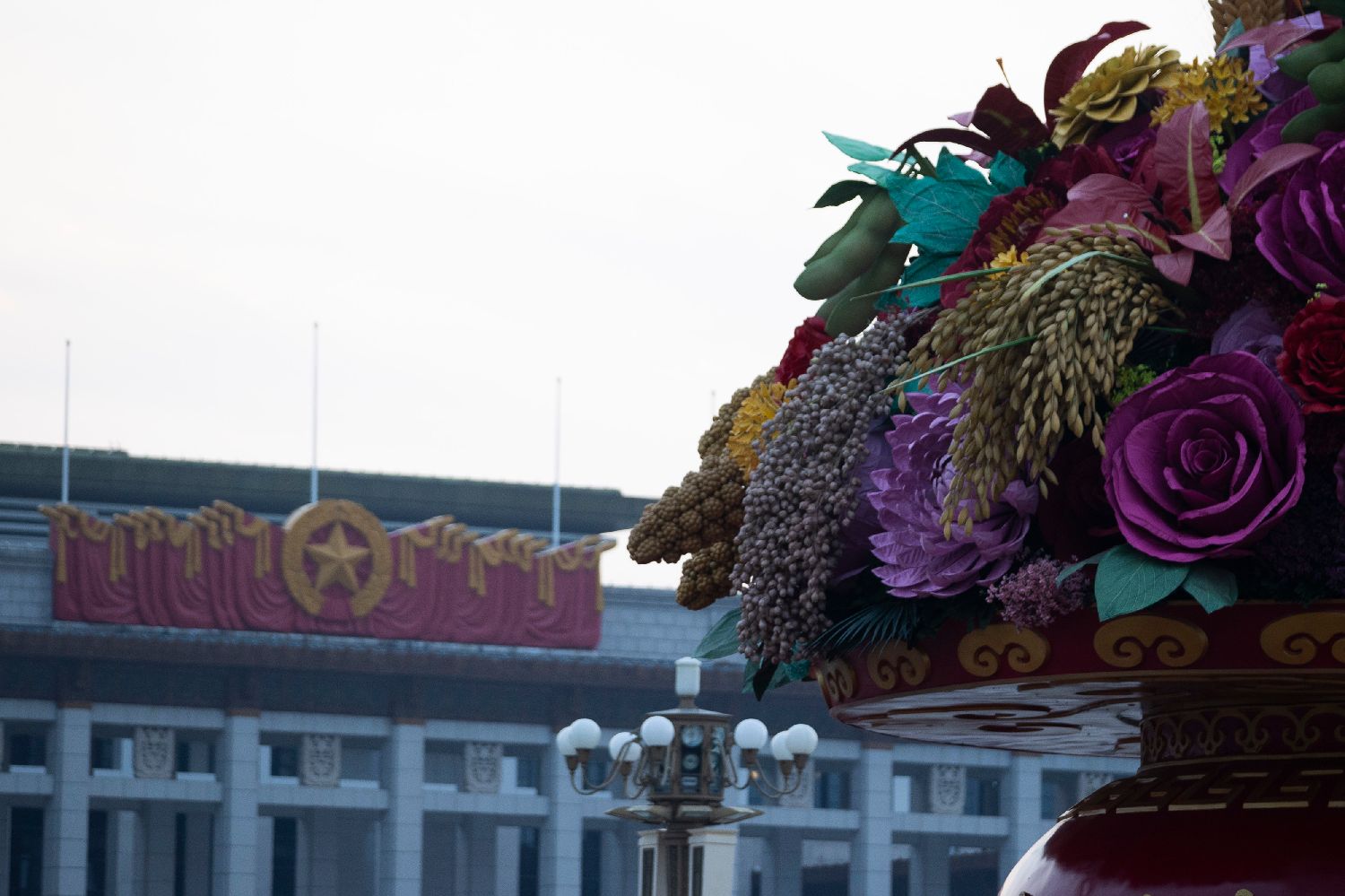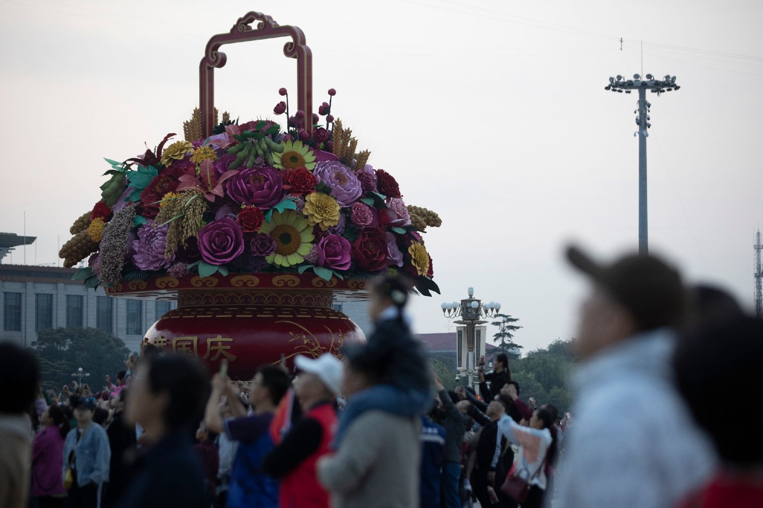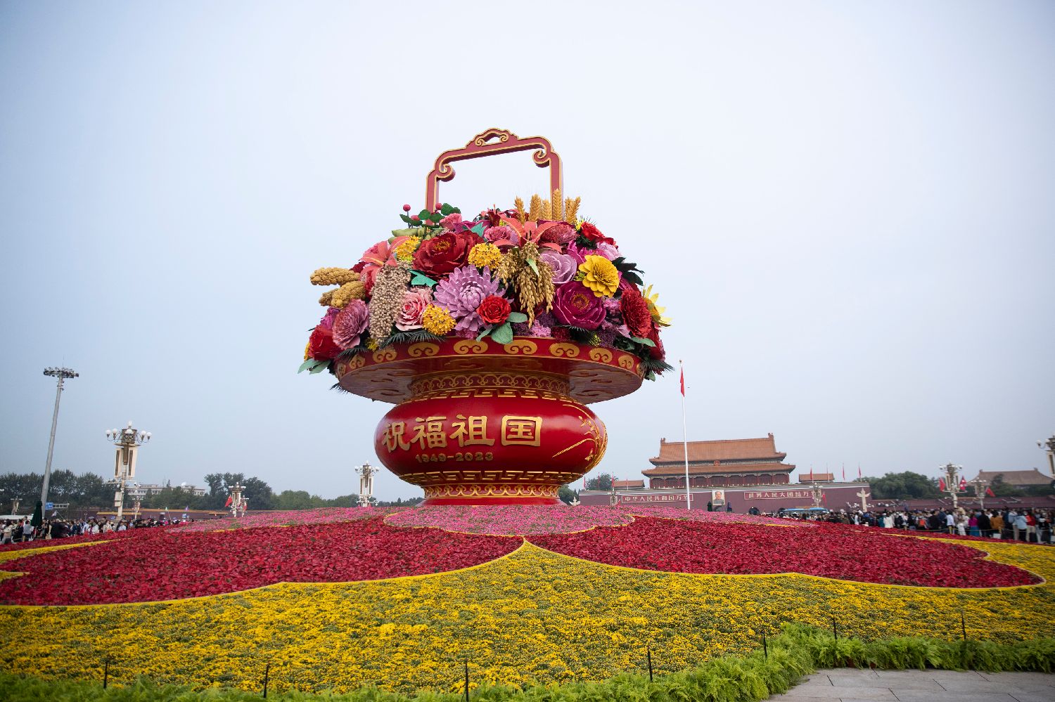 2023年9月25日,蕴含“五谷丰登”祝福的中国国庆节主题花坛亮相北京天安门广场。