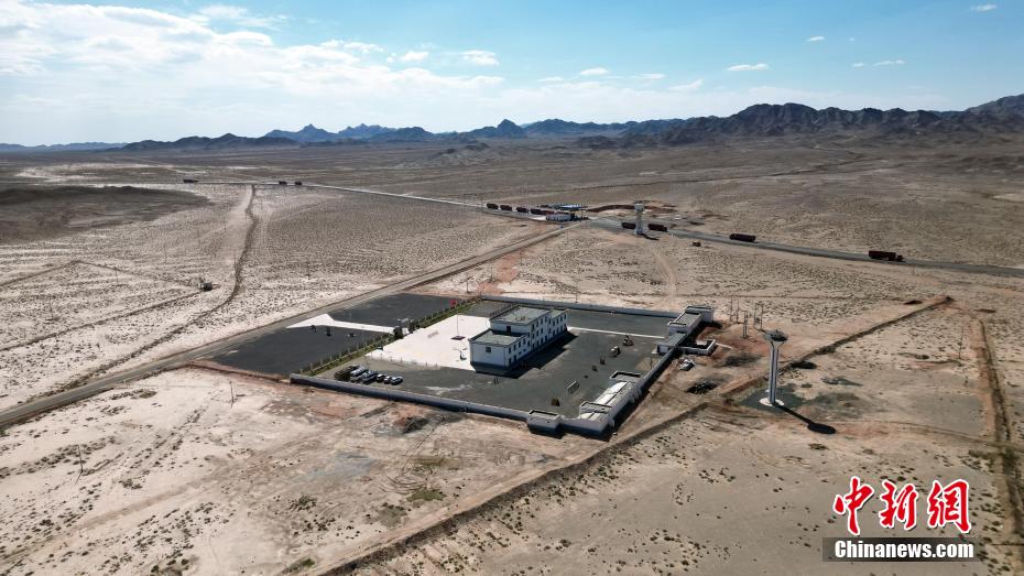 马鬃山位于巴丹吉林沙漠边缘地带,是一片广袤无垠的黑色戈壁滩。马鬃山镇向西80公里便抵达甘肃最西边的一个行政村——明水村,常年风沙肆虐,夏季酷热难耐,冬季寒风凛冽,近百公里范围内看不到一棵自然生长的树,自然条件异常艰苦。图为航拍视角下的明水边境检查站。(图片来源:中新网)