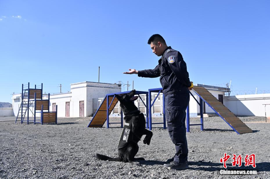 近日,甘肃出入境边防检查总站酒泉边境管理支队所辖的明水边境检查站和公婆泉边境检查站的训练场上,训导员与警犬正在进行训练。为锻炼警犬在极端天气、复杂环境下的适应能力,该检查站进行警犬拉练,包括追踪、鉴别、越障、箱包搜毒、车辆搜爆、指令服从、扑咬放口、耐力训练等科目。(图片来源:中新网)