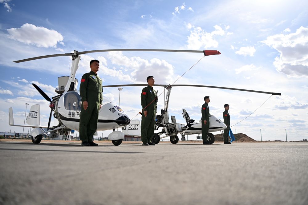 8月23日,甘肃出入境边防检查总站酒泉边境管理支队利用旋翼机在甘肃省酒泉市肃北蒙古族自治县马鬃山边境管理区戈壁荒漠地区开展空中警务巡逻、快速机动侦查。这支“飞天警队”于2020年成立。图为“飞天警队”的民警做好飞行前准备。(图片来源:中新社)