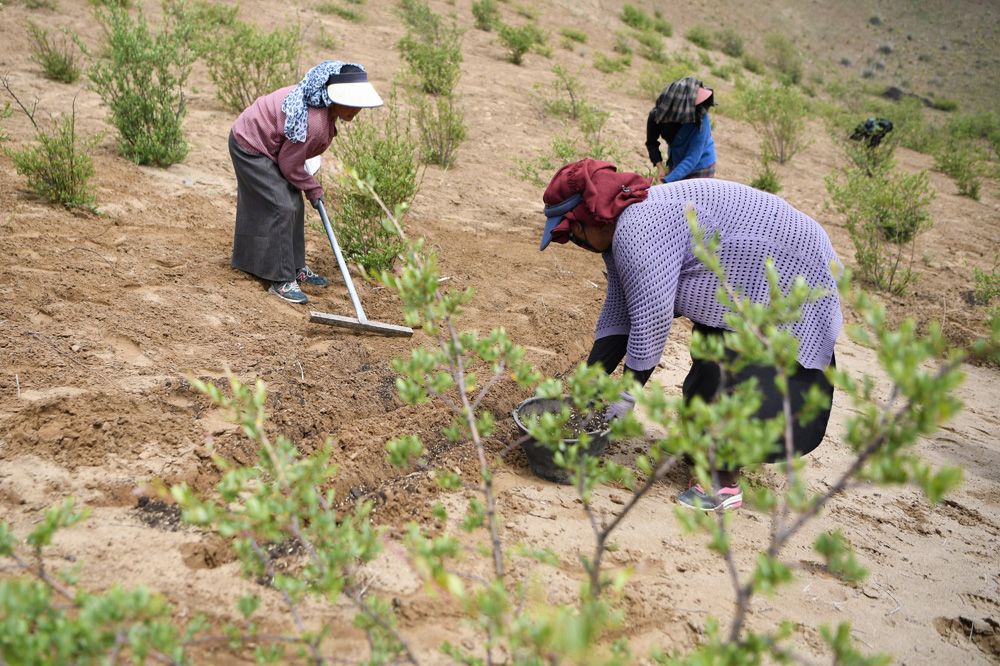 20世纪八九十年代,受自然和人为因素的影响,玛曲湿地的草原出现不同程度沙化退化现象,为扭转生态环境恶化趋势,近年来,玛曲县持续开展山水林田湖草沙一体化保护和修复工作,实施了退牧还草、沙化退化草原综合治理、湿地保护与修复、草原鼠害防控等一系列生态保护工程项目,使治理区林草植被逐步恢复。图为牧民在玛曲县欧拉镇黄河沿岸一处沙化草原治理点补种草籽。(图片来源:新华社)
