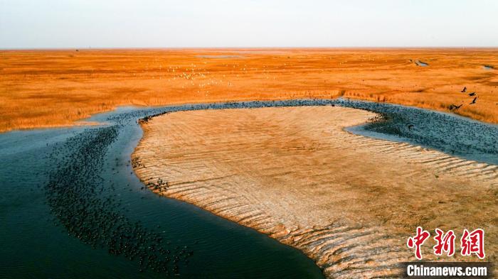 江苏盐城海滨的滩涂是无数鸟类的家园。(图片来源:中新网发/盐城市委宣传部供图)