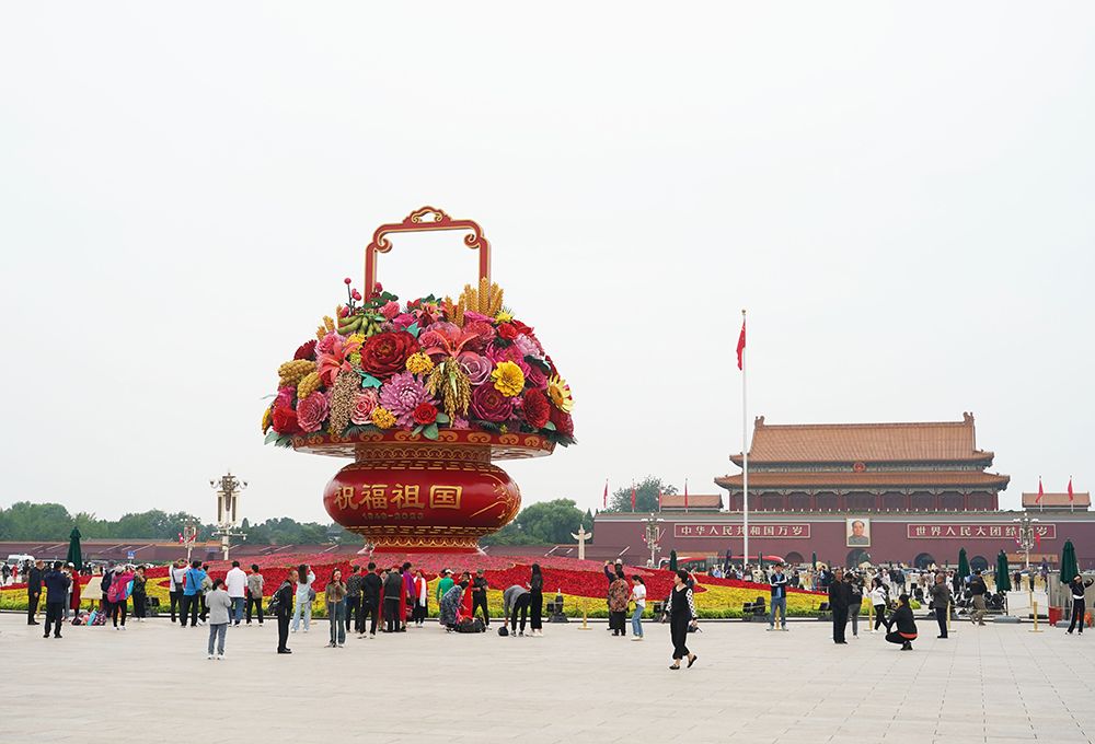 在北京天安门广场拍摄的“祝福祖国”巨型花篮。(图片来源:新华社)
