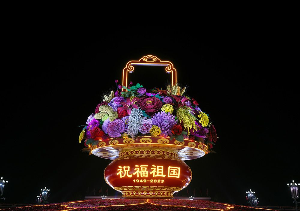 北京天安门广场“祝福祖国”巨型花篮亮灯,庆祝国庆节。(图片来源:中新社)