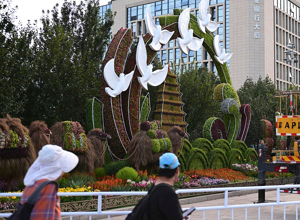 中秋及国庆节假期日益临近,北京天安门广场的“祝福祖国”巨型花篮及长安街沿线立体花坛精彩亮相,吸引游人及市民观赏留念。