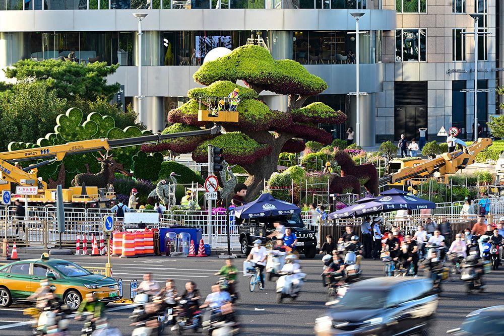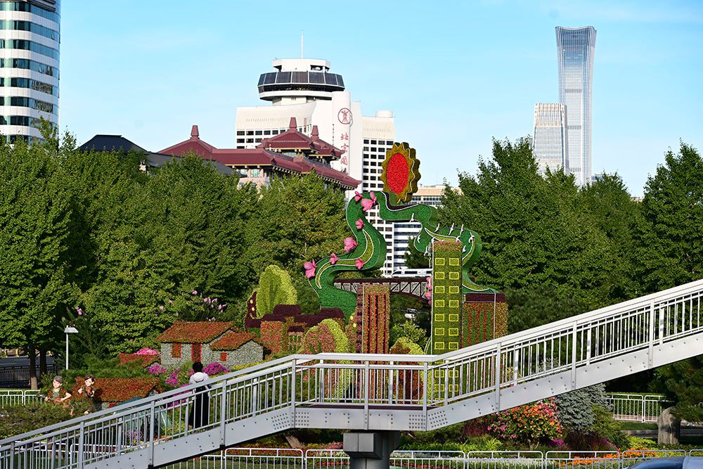 长安街沿线建国门至复兴门之间将布置主题花坛10处。图为市民路过北京东单路口“和谐共生”主题花坛。(图片来源:中新社)
