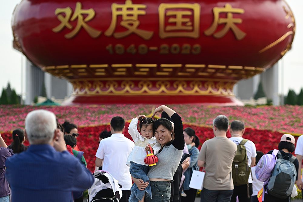 游客在北京天安门广场的“祝福祖国”主题花坛前合影留念。(图片来源:中新社)