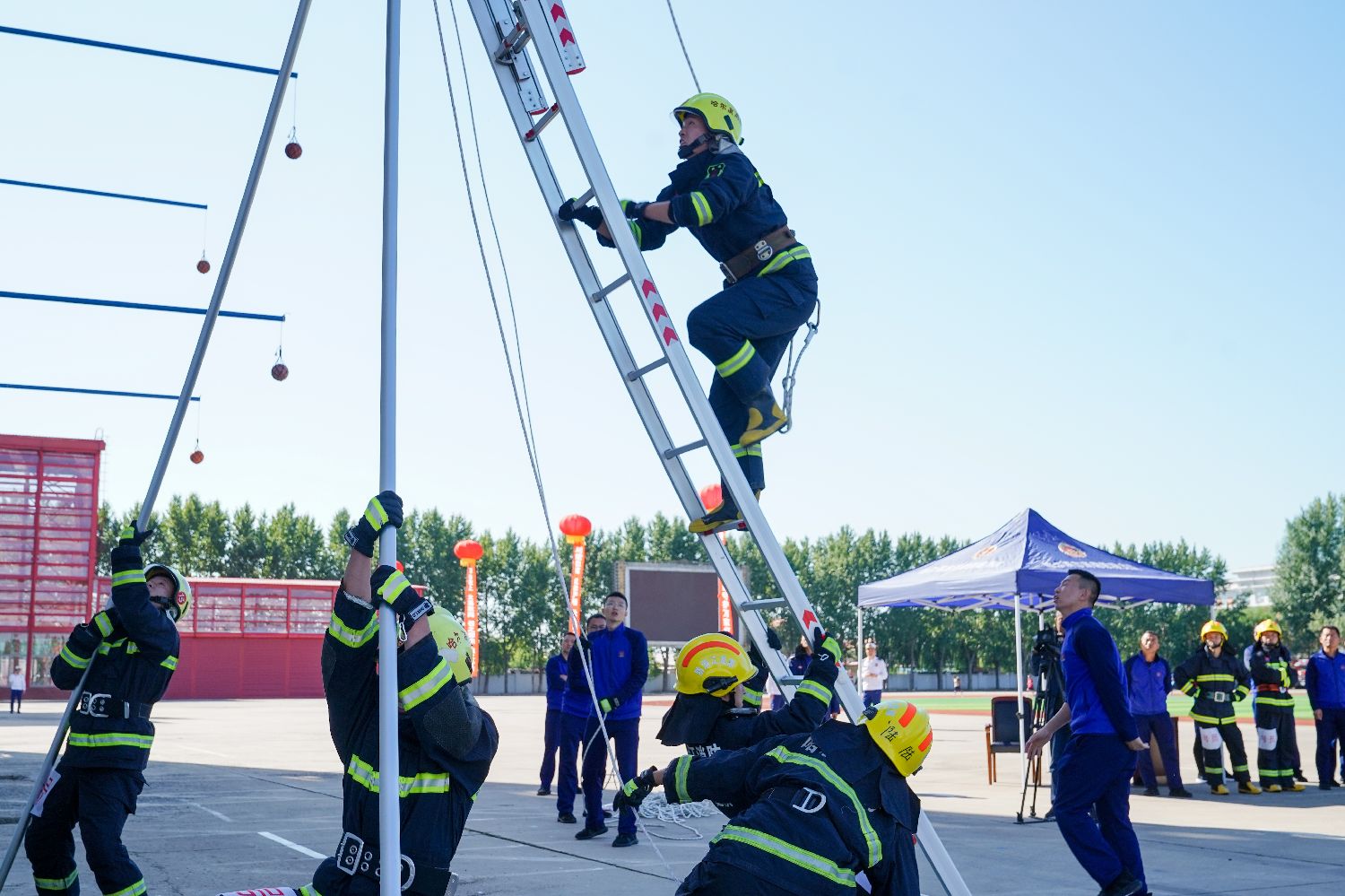 9月20日,黑龙江省哈尔滨市消防救援支队2023年度夏季实战技能比武竞赛在总队训练与战勤保障支队举行。图为攀登15米金属拉梯操竞赛。 (图片来源:中新社)