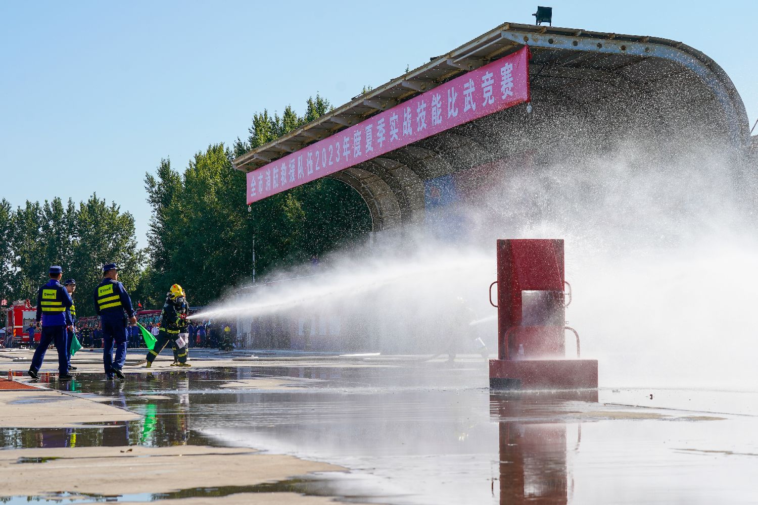 9月20日,黑龙江省哈尔滨市消防救援支队2023年度夏季实战技能比武竞赛在总队训练与战勤保障支队举行。图为灭火竞赛。(图片来源:中新社)