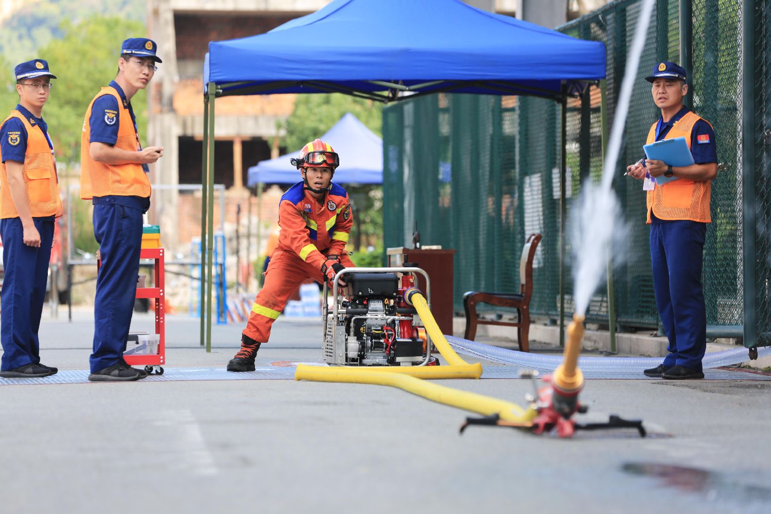 9月25日,在2023年福建省消防行业职业技能竞赛现场,消防员参加“手抬机动泵维护及射水打靶”项目的比拼。当日,2023年福建省消防行业职业技能竞赛在福州开幕,来自全省各地市的10支参赛队伍、165名参赛队员,将围绕100米消防障碍、攀登挂钩梯、无人机侦察投送等20个项目模块展开角逐,旨在通过技能比拼提高消防救援人员综合业务素质及应急救援处置能力。(图片来源:新华社)