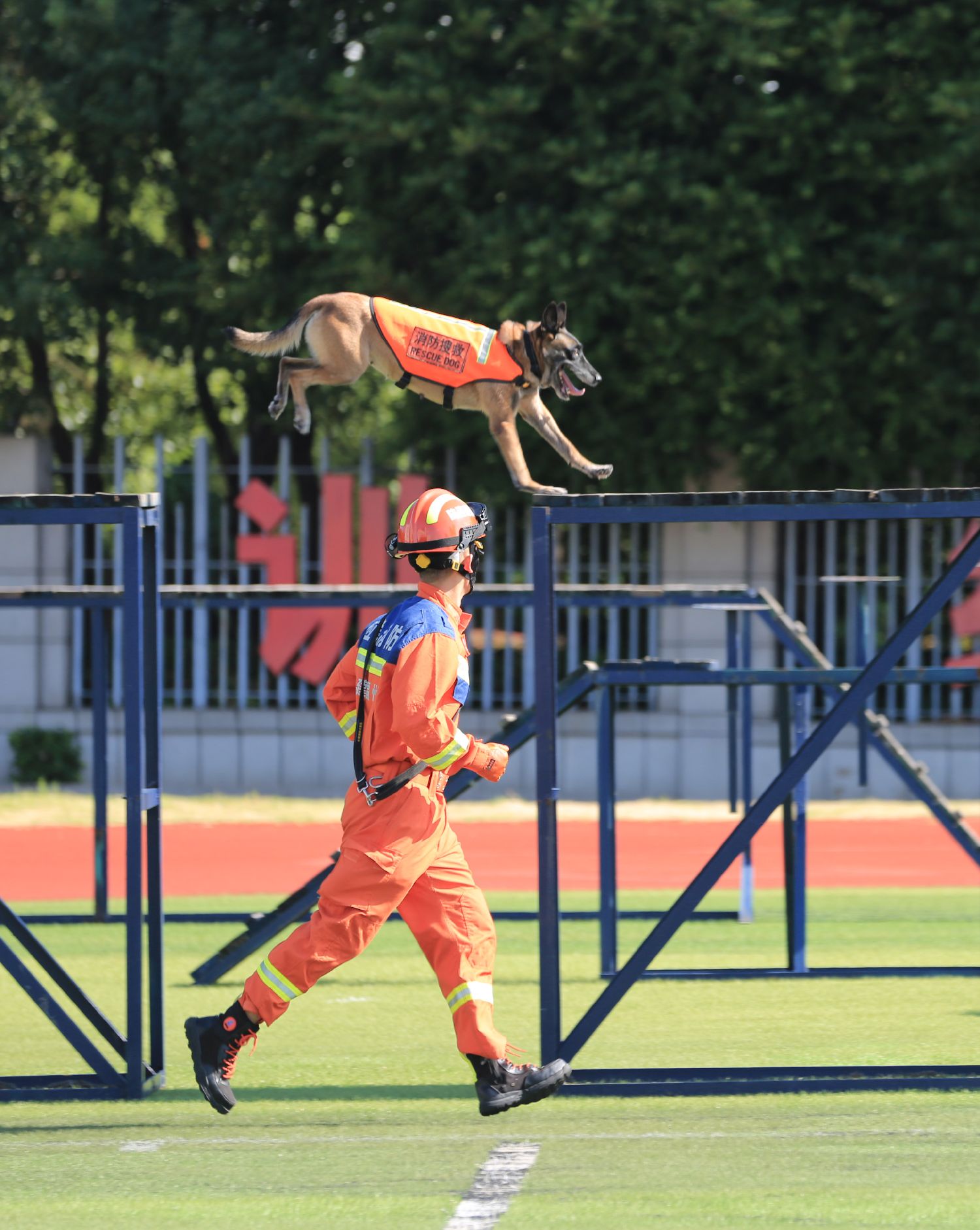 9月25日,在2023年福建省消防行业职业技能竞赛现场,消防员参加“搜救犬救援”项目的比拼。(图片来源:新华社)
