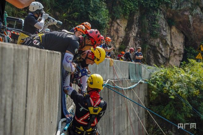 在9月16日至19日于广东省韶关市举行的第三届GRIMPDAY ASIA格锐德世界绳索救援赛·亚洲赛中,福建省森林消防总队特勤大队参与竞技。图为福建省森林消防总队特勤大队绳索救援队队长与担架手,正通过低岩角的方式将伤员运送至安全地点。(图片来源:北京央广网)