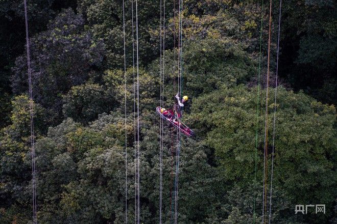 在9月16日至19日于广东省韶关市举行的第三届GRIMPDAY ASIA格锐德世界绳索救援赛·亚洲赛中,福建省森林消防总队特勤大队参与竞技。图为双盲组比赛中,担架手携伤员过绳结。(图片来源:北京央广网)