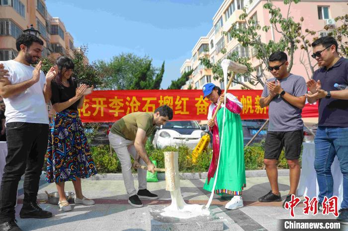 9月27日,来自俄罗斯、阿根廷、哈萨克斯坦、塔吉克斯坦、越南、摩尔多瓦等国家和地区的10余名留学生来到山东省青岛市李沧区,参加崇德尚礼·古韵新潮“南山百家宴·邻里一家亲”中秋欢动季活动,与当地民众共迎中秋,分享节日欢乐。图为打年糕项目吸引海外留学生体验。(图片来源:中新网)