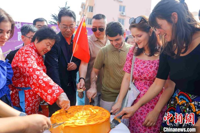 9月27日,图为海外留学生与当地居民一同分切“月饼”蛋糕。(图片来源:中新网)