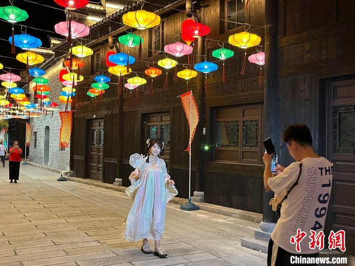 9月27日晚,正值中秋、国庆双节前夕,以宜春第十七届月亮文化旅游节为契机,江西省靖安县在西门古街举行“靖安国风弄潮生活季”活动,吸引了大量青年人身着古装前往现场拍照打卡。(图片来源:中新网)