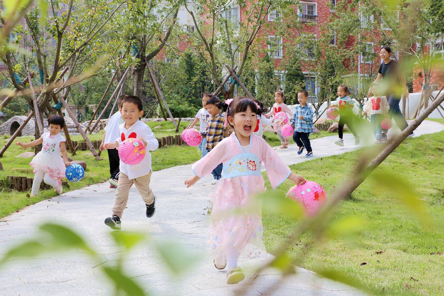 9月26日,山东省青岛西海岸新区金河路幼儿园小朋友提着自制中秋花灯游园。(图片来源:新华社)