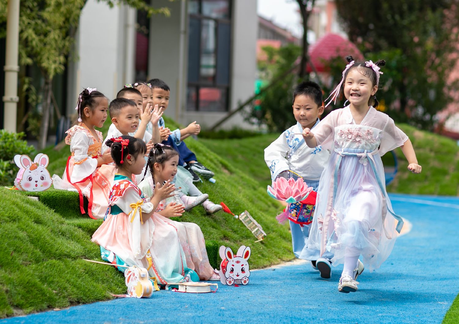 9月27日,在江苏省兴化市阳山幼儿园,小朋友进行提花灯比赛游戏。(图片来源:新华社)