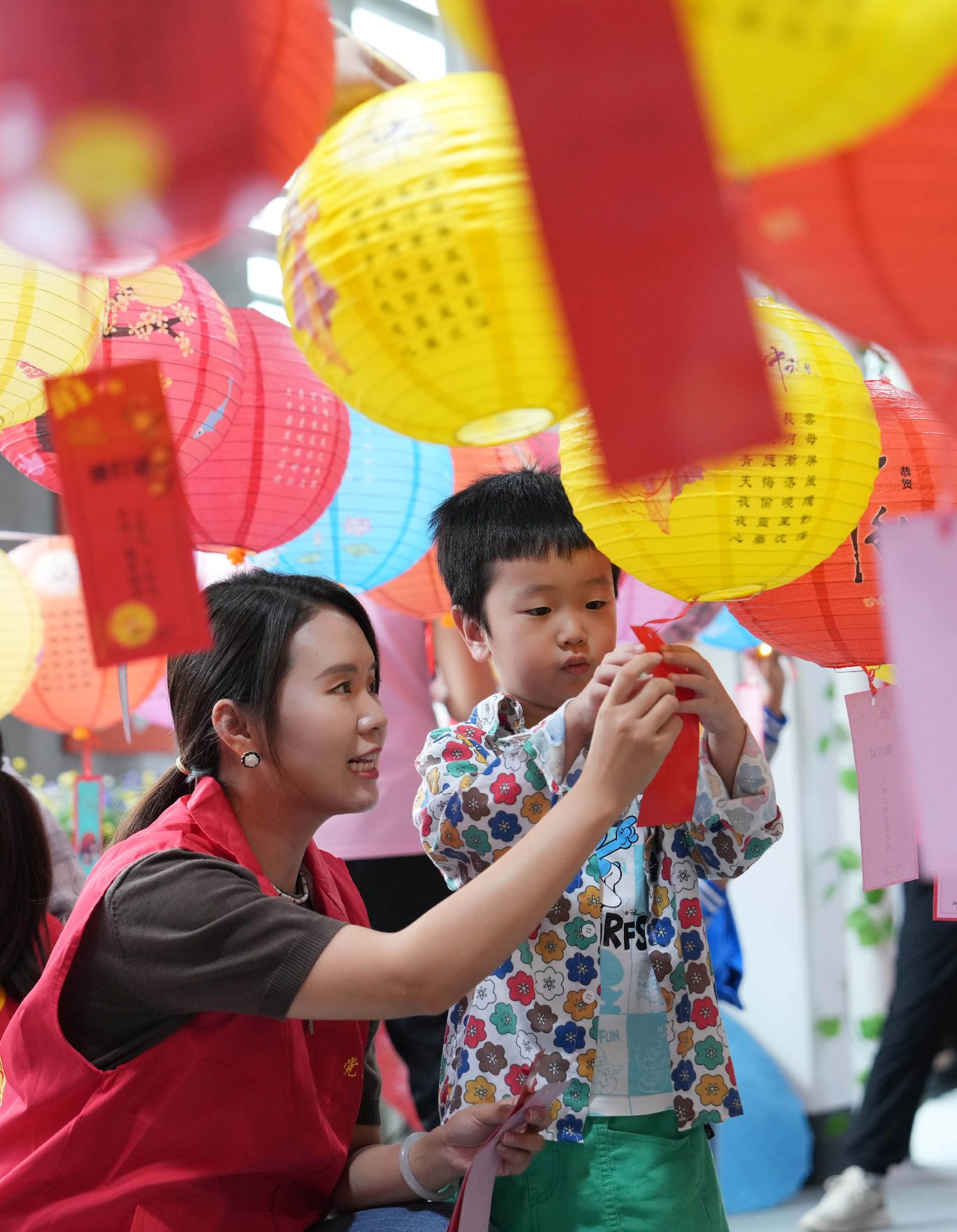 9月26日,在重庆市北碚区澄江镇新时代文明实践站,志愿者和小朋友一起猜灯谜。(图片来源:新华社)