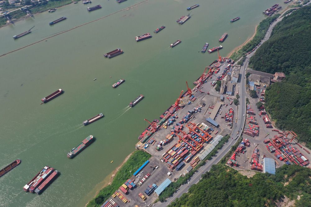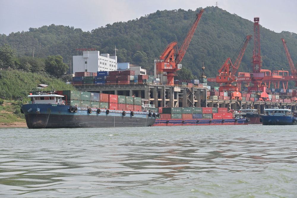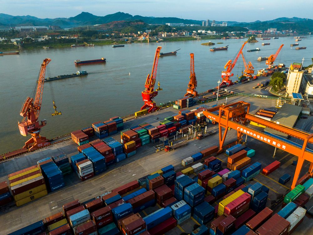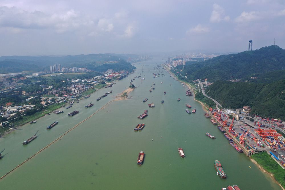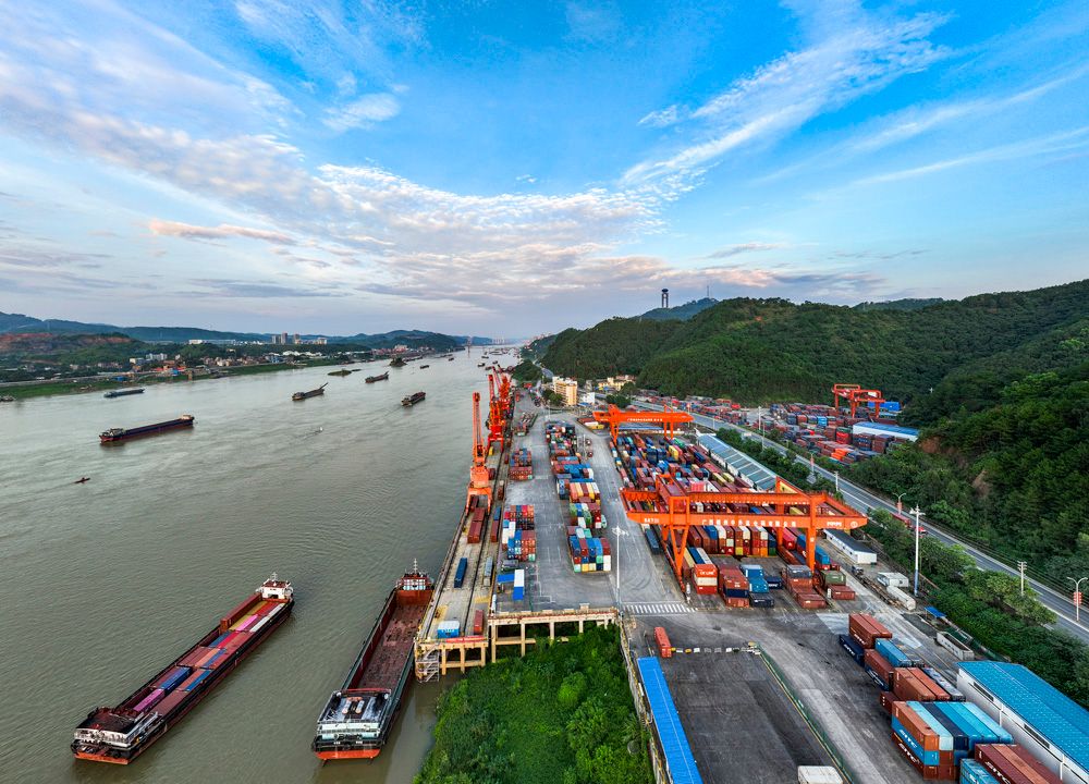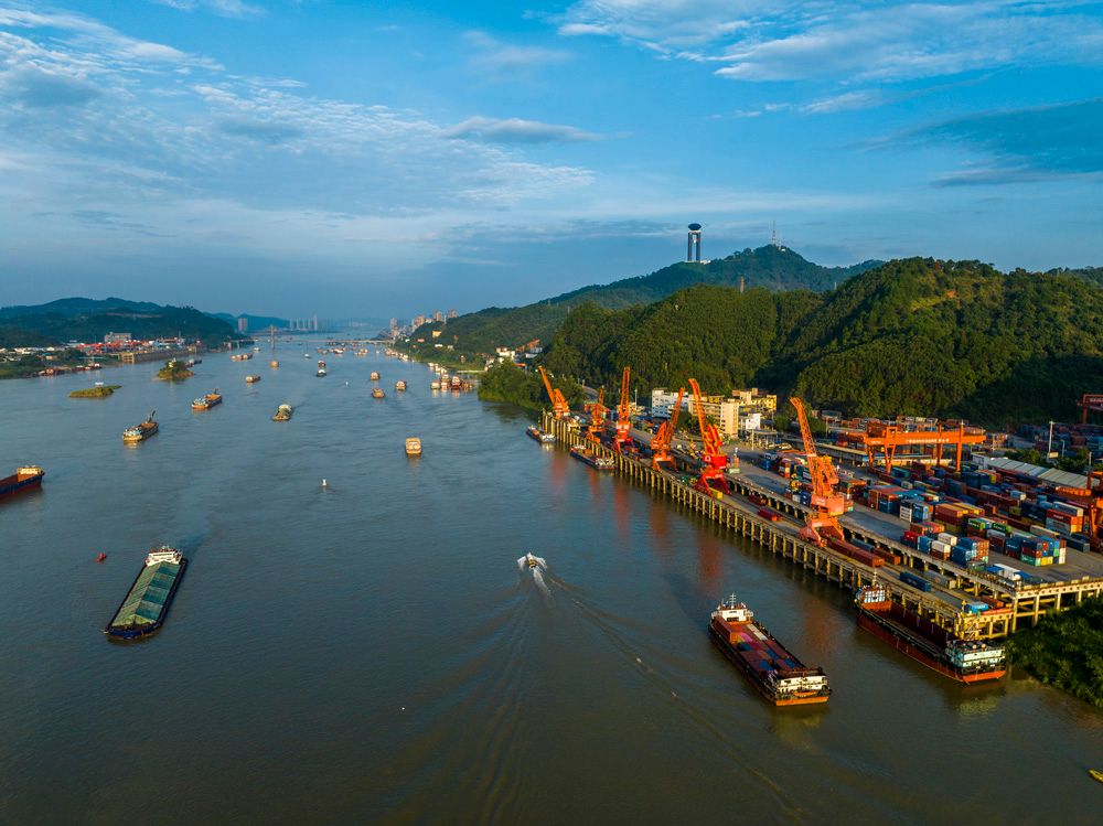 广西梧州是西江重要枢纽城市,大量煤炭、水泥等资源经此运往粤港澳大湾区。图为9月4日,广西梧州市中外运仓码有限公司集装箱码头上的起重设备在紧张有序进行装卸作业,西江船只往来穿梭。