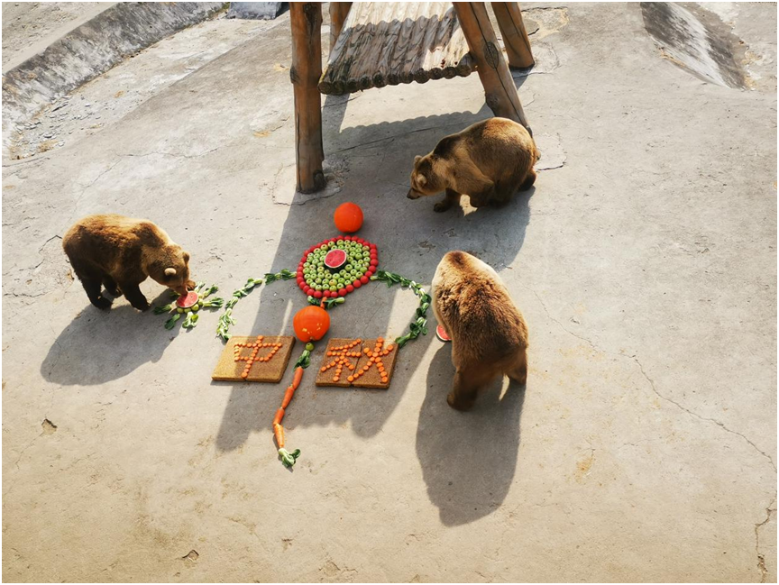 金秋时分喜迎双节,哈尔滨北方森林动物园为园内的动物们准备了以中国传统美食月饼为主题的中秋美食盛宴。熊山里有着琳琅满目的水果、蔬菜造型中间摆放的4个大月饼,棕熊在大快朵颐。(图片来源:《中国日报》)