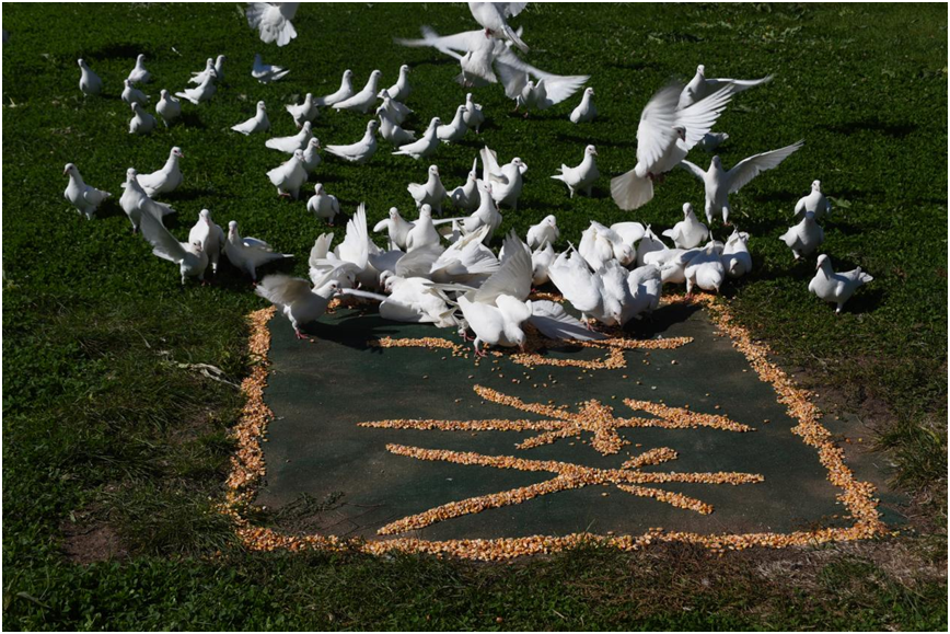 近日,哈尔滨北方森林动物园,孔雀、珍珠鸡、和平鸽分享4平方米大月饼。(图片来源:《中国日报》)