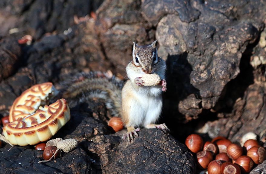 9月28日,辽宁沈阳,热心市民携带五仁月饼、榛子、花生、核桃等坚果来到北陵公园,为公园里的小松鼠、花栗鼠等小动物过中秋节,图为花栗鼠在享用中秋节日“大餐”。(图片来源:中新社)