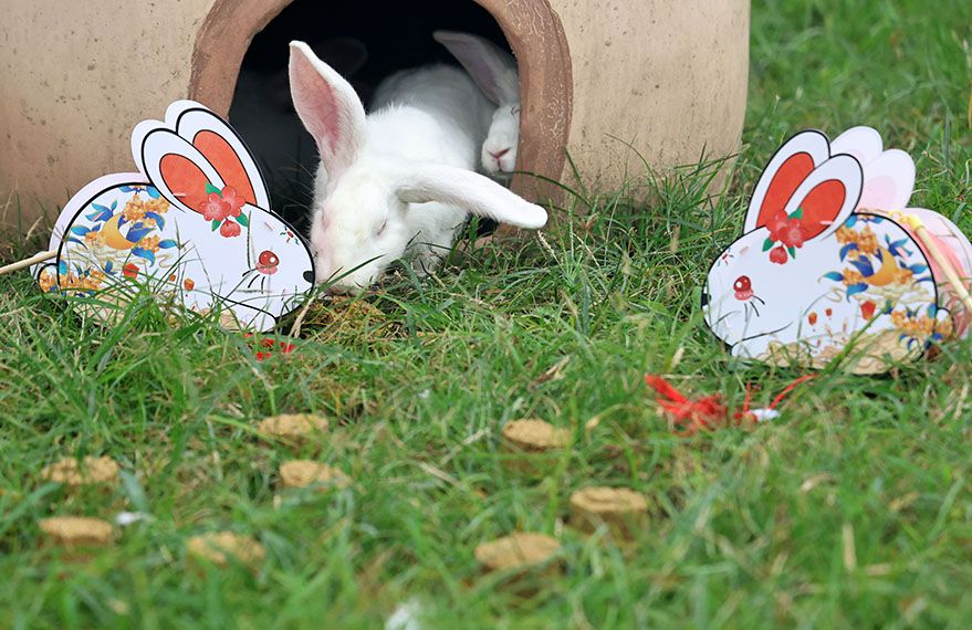 9月27日,在江苏省南通市,南通森林野生动物园的兔子在享用各种草料、胡萝卜制作成的“月饼大餐”。(图片来源:中新社)