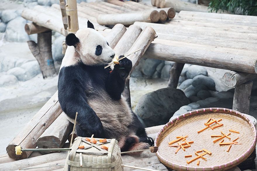 9月27日,在江苏省南通市,南通森林野生动物园的大熊猫在吃用玉米面、豆面、竹粉、微量元素等制作成的“月饼大餐”。(图片来源:中新社)