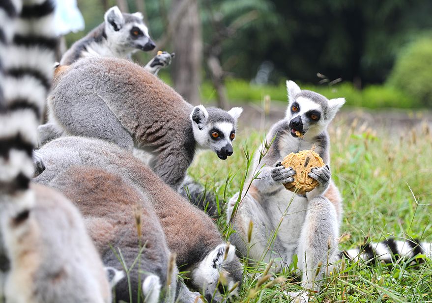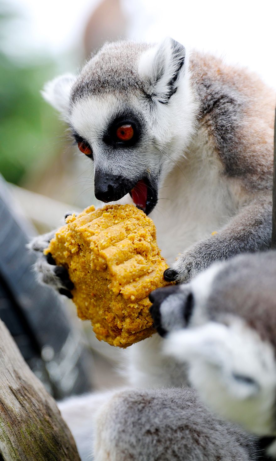 9月25日,环尾狐猴在品尝定制的“中秋月饼”。中秋临近,在青岛森林野生动物世界,动物们乐享工作人员精心准备的“中秋大餐”。(图片来源:新华社)