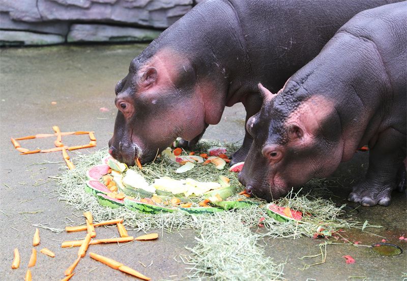 9月25日,两只河马在品尝定制的“中秋月饼”。中秋临近,青岛森林野生动物世界的工作人员准备了花样百出的“奇特月饼”,让动物们也品尝到了中秋的”味道“。(图片来源:人民网)