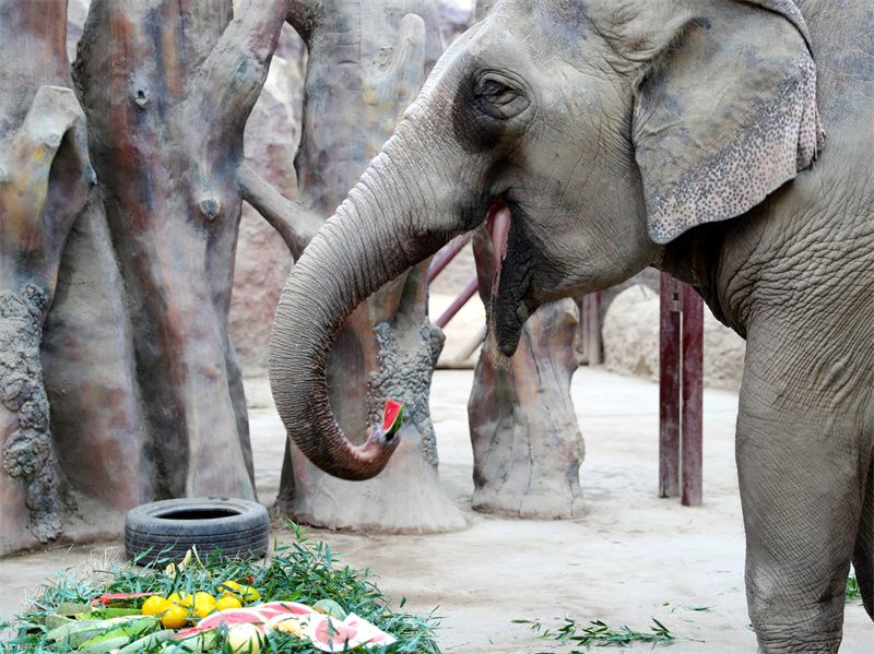 9月25日,一只大象在品尝定制的“中秋月饼”。中秋临近,青岛森林野生动物世界的工作人员准备了花样百出的“奇特月饼”,让动物们也品尝到了中秋的”味道“。(图片来源:人民网)