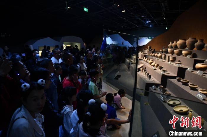 10月5日,成都金沙遗址博物馆持续火爆。图为金沙遗址博物馆出土陶器物吸引游客。(图片来源:中新网)