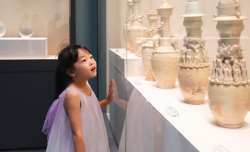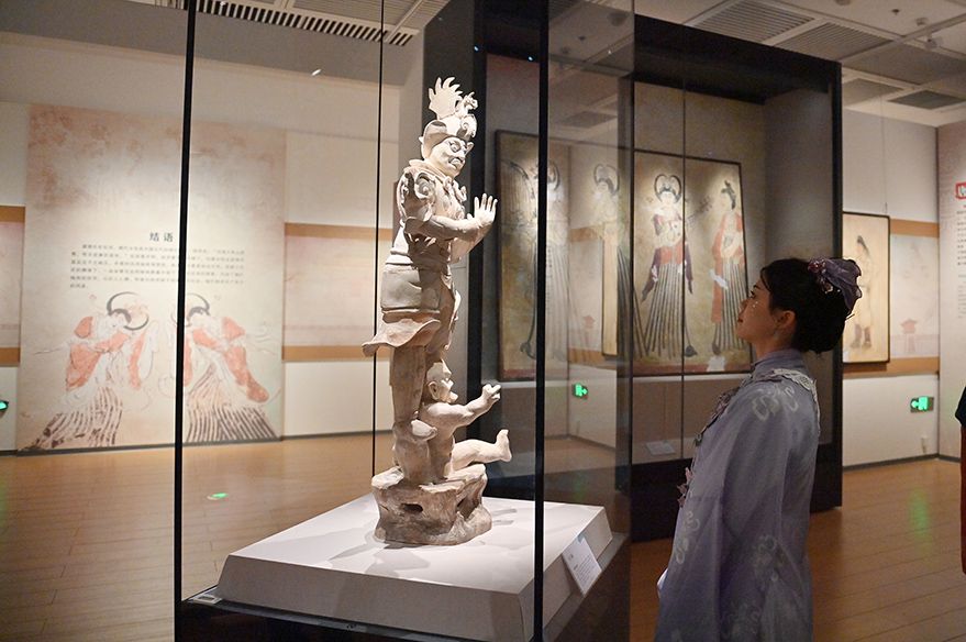 10月5日,民众在吉林长春伪满皇宫博物院博物馆之眼艺术宫参观“柳丝梅绽正芳菲——初唐女性生活掠影展”,乐享假期时光。图为游客参观白陶天王俑。(图片来源:中新社)