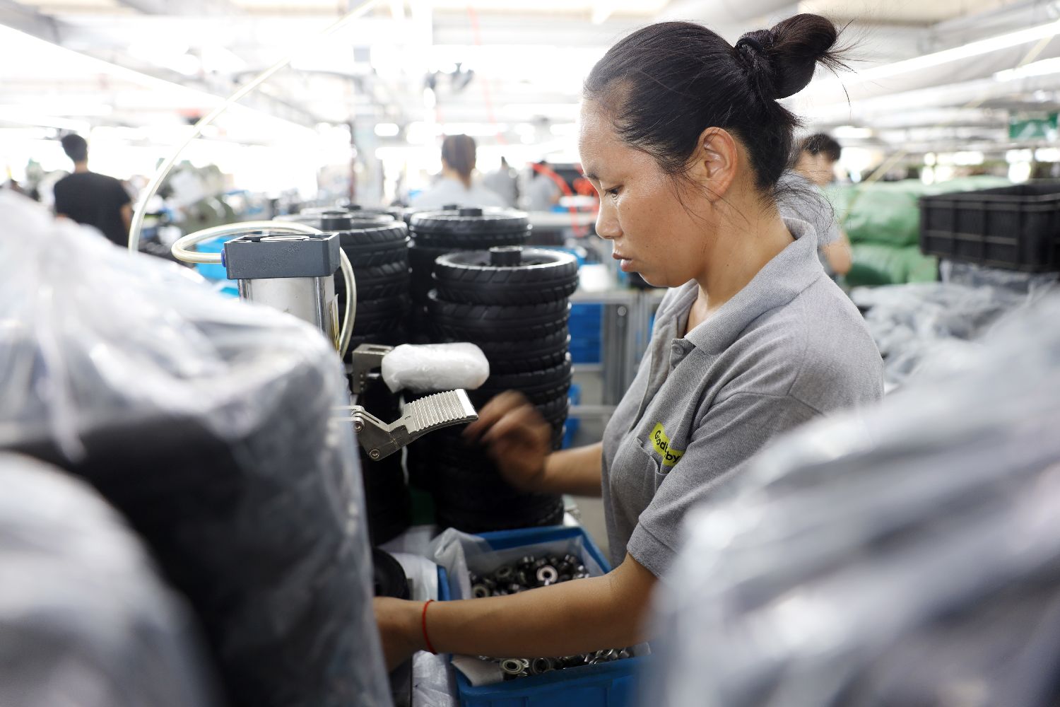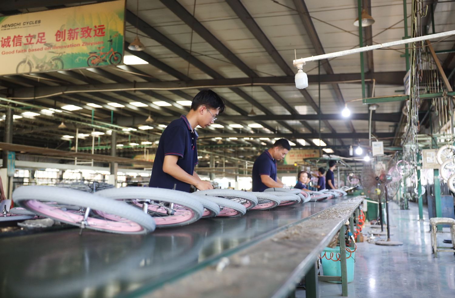 8月17日,河北恒驰自行车零件(集团)有限公司车间,工作人员正在组装一款童车车轮。