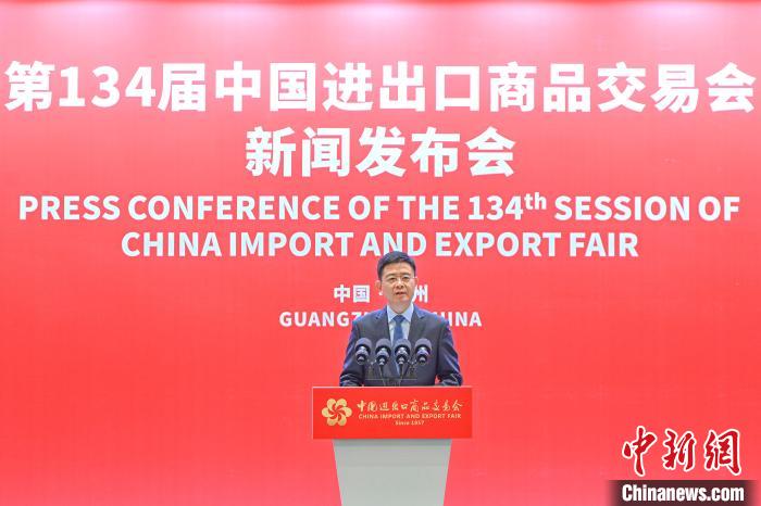 广交会新闻发言人、中国对外贸易中心副主任徐兵向与会的媒体介绍第134届广交会总体筹备情况。(图片来源:中新网)