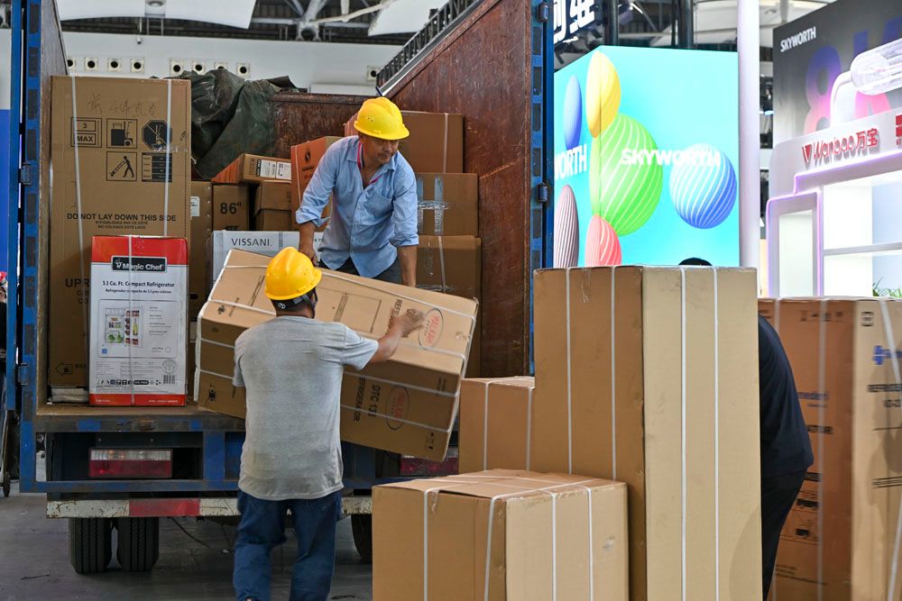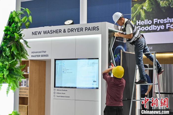 据徐兵介绍,经过各方共同努力,本届广交会筹备工作进展顺利,目前已基本就绪。图为布展人员穿梭在广交会展馆内。(图片来源:中新社)