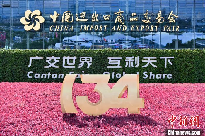 图为广交会展馆外搭建的“134”标识。(图片来源:中新网)