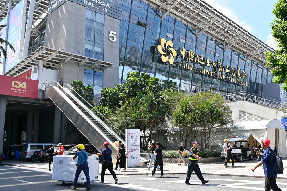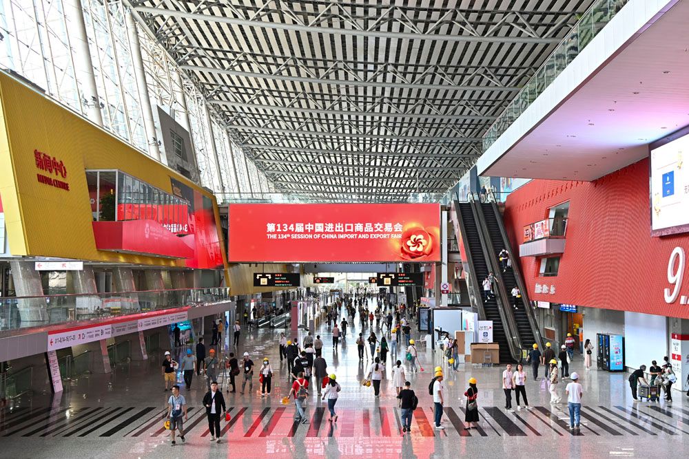 第134届中国进出口商品交易会(广交会)将于10月15日至11月4日在广州分三期举办,同时常态化运营线上平台。图为10月13日,在广东省广州市,布展中的广交会展馆。(图片来源:中新社)