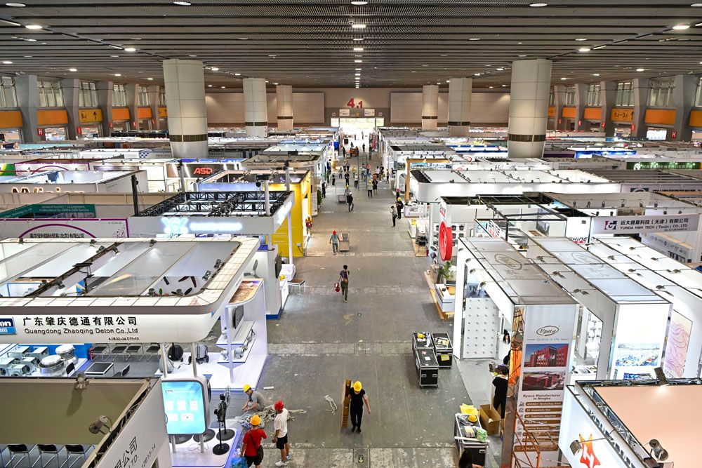 本届广交会展位总数7.4万个,比上届增加近4600个,其中出口展7.2万个、进口展1550个。图为搭建中的展位。(图片来源:中新社)