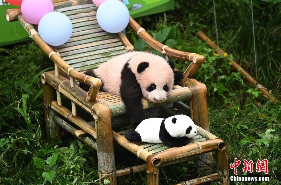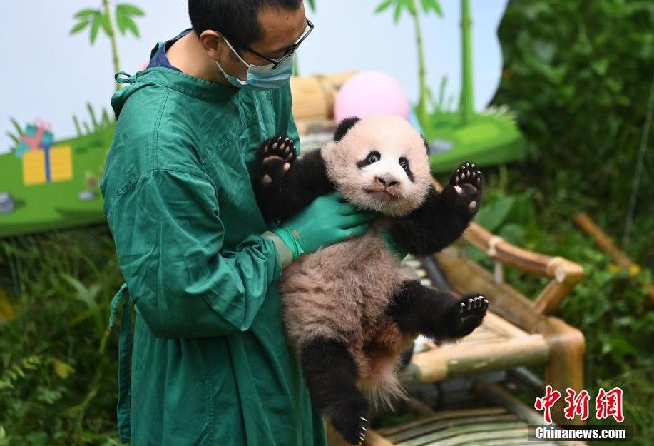 大熊猫宝宝与游客见面。