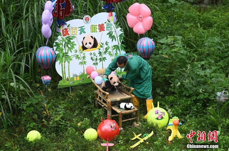 10月13日,重庆动物园为新生大熊猫宝宝举行“百日宴”,大熊猫宝宝也正式与游客见面。活动现场,熊猫“奶爸”在户外摆放了不少玩具,作为百天礼物供它玩耍,熊猫宝宝在游客面前萌态十足。据介绍,7月6日,大熊猫“莽仔”顺利产下这只雄性宝宝,宝宝初生体重191g,是在重庆动物园出生的最重的大熊猫个体。