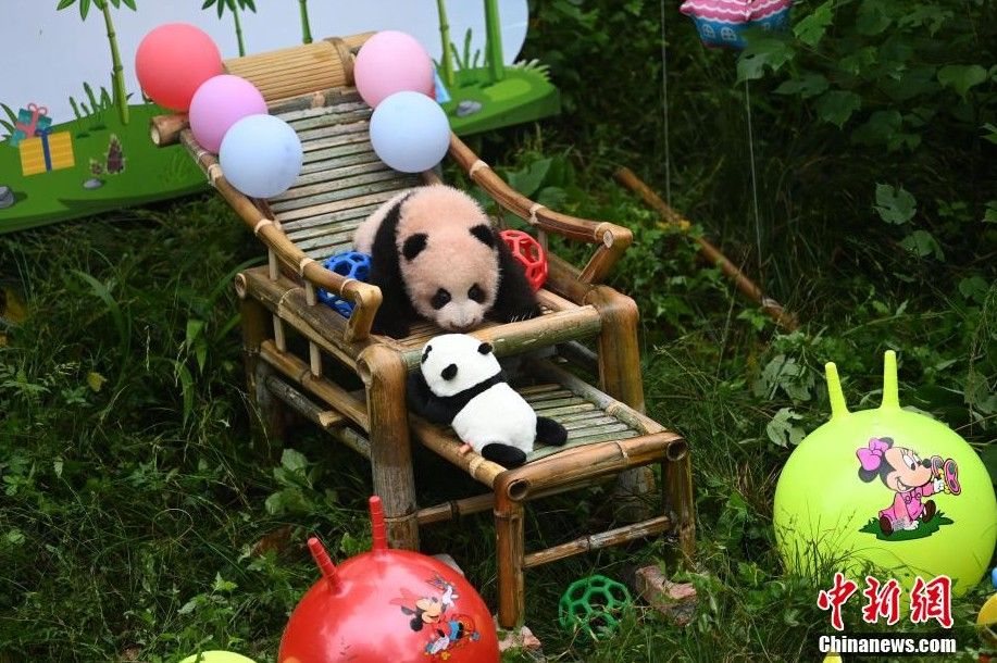 大熊猫宝宝玩耍毛绒玩具。(图片来源:本文图片均自中新网)