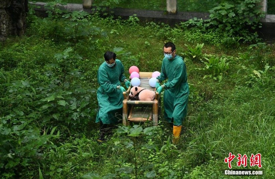 工作人员用椅子抬着大熊猫宝宝与游客见面。